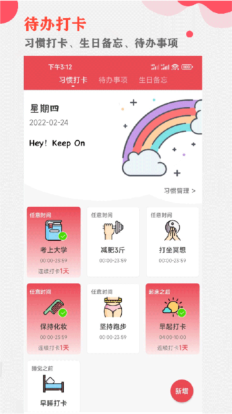 4、备忘提醒:拥有完善的提醒功能,具有时间清单,事件待办,小习惯,小日常打卡,番茄钟,生日,纪念日,倒数日,人生进度,生日备忘录等小工具,满足您的日常生活小需求;