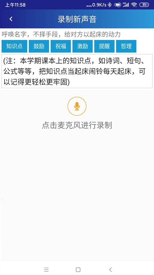 如果您是学生,也可以把近期需要记忆的诗词、英语短句、方程式等内容录制成起床音频,实践证明,把知识点作为起床闹铃,能够充分利用起床的碎片时间,记得比较牢。