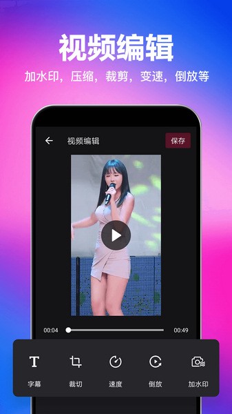 视频去水印、裁剪、剪切、倒放、加速、合并、压缩、旋转、变速等,还支持添加音乐、字幕、水印等各项视频编辑功能