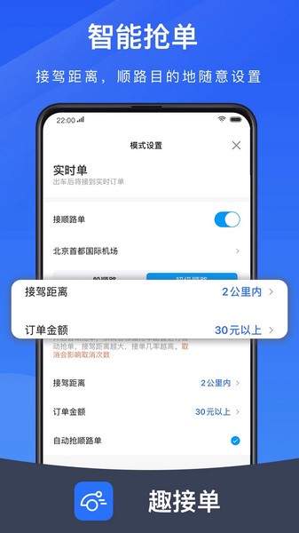 这款趣接单司机端app真的是网约车司机的福音!它能根据你的需求自由设置接单距离、金额和目的地,超级灵活。最棒的是智能抢单功能,系统会自动帮你找最近的订单,减少空驶时间,提高效率。