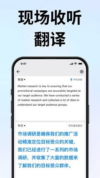 1、同传翻译:流式语音识别,随说随译。满足出国翻译、旅行翻译、旅游购物翻译、英语学习翻译等需求。