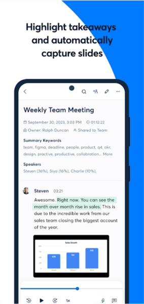 Otter翻译软件官方具备多种用途,包括但不限于自动记录会议内容并与团队成员分享,确保大家保持同步;录制和转录音频资料如采访、讲座、播客等;为聋人和听力障碍社区提供实时字幕;自动标点、识别说话者并生成关键词摘要;群内实时分享成绩;搜索和回放音频;编辑和导出各种格式文件等。