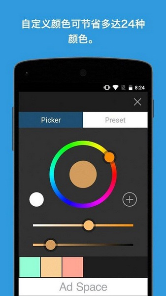 您可以保存的24种颜色自定义颜色。点击并按住自定义调色板删除保存的颜色。