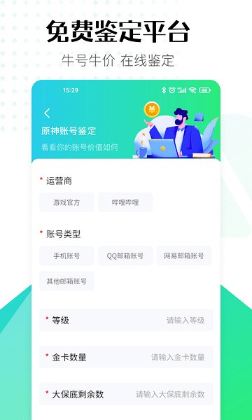 账号牛app是一款专门提供游戏账号交易的平台,其中涵盖了非常丰富的游戏类型,包括王者荣耀、和平精英、原神、英雄联盟等等,不管是端游还是手游全都可以在这里找到相关服务,给大家带来最棒的使用体验。平台内提供第三方交易担保,为出售方和购买账号的用户都提供了真实且安全的交易服务,并且有任务问题还会有专业的客服帮助大家解决,用户们可以放心购买。