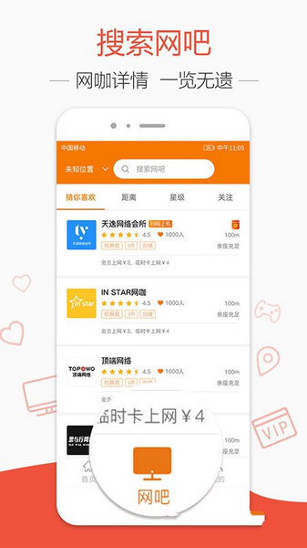 【搜索网吧】实时定位,可按距离、星级等搜索附近网吧.