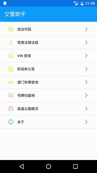 1、首先,用户在本站下载并安装好交警助手最新版本后,打开进入,在这里,可以查询违法代码、常用的法律法规、VIN查询等;