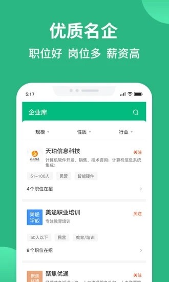 覆盖行业:互联网、金融、汽车、房产、快消、制造、人工智能、广告传媒等各行各业,现已成为销售、财务、技术、IT、产品、人资、管理……广大求职者选择的应用APP。