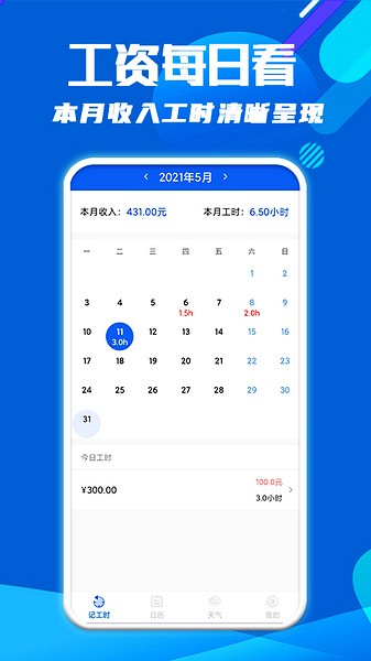 记加班时间:记录加班时间,快速为您换算成工资,让您每天都可以看见自己的劳动成果