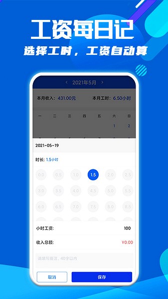 这个“每日记工资”app真的很实用!它主要是帮人记录每天的工作时间和计算工资的,特别适合兼职、临时工或者小时工用。有了它,再也不用担心工资对不上了。操作也挺简单的,选好时长填上每小时工资就能自动算收入,保存一下就搞定了。