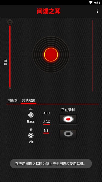 除了均衡器能调节高低音以外,你还可以使用“其他影响”里的功能,可以降噪去杂,还可以设置Bass和VR,该应用还可以进行录制声音文件,并进行保存,一些重要的东西,一时记不住就可以使用该功能,可以很好的防止重要通话丢失,可以根据下图由左向右进行操作。记住保存路径,以便寻找录音文件。