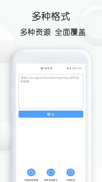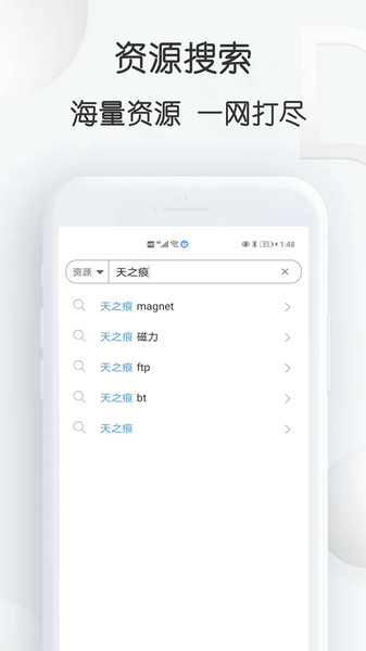 【资源搜索】支持电影、音乐、文档、图片、动漫等文件资源的搜索,不管是网络链接、bt种子搜索、磁力搜索,一键即可开启搜索,同时可以收藏至本地,资源无忧。