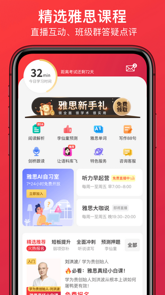 学为贵雅思的另一个亮点在于其丰富的互动功能。每天晚上7:30的全球考鸭万人互动活动,让我有机会与其他考生交流心得,分享备考经验。应用中的口语预测和单词掌贵模块也非常实用,前者提供了最新的口语话题预测和题库,后者则通过游戏化的单词记忆法,让我在轻松愉快的氛围中掌握大量核心词汇。此外,名师们的互动直播课更是让我受益匪浅,他们的专业指导和实战经验让我对考试更加有信心。