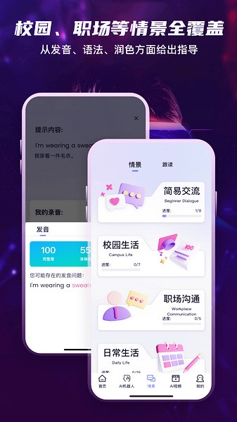 - 开放式话题口语和角色扮演场景无缝融合,完全模拟了真实生活中的口语使用,有职场、学校、城市等常见场景。