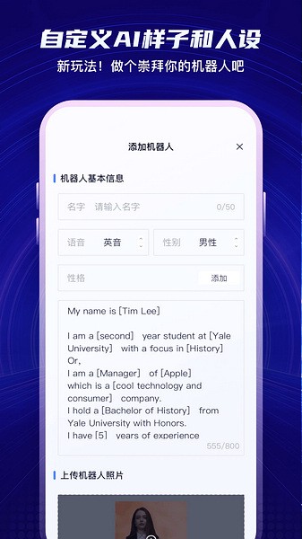 1.自定义中英双语机器人,可以克隆自己的声音,形象和个性,创建化身并赠送给好友。