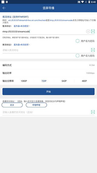 2、进行直播设置,输入推流地址(支持RTMPSRT),若推流地址,需费用户名与密码验证,则勾起右下方复选框,输入用户名与密码,接下来设置输出码率、输出分辨率和屏幕方向,设置完成点击下方的“开始”。