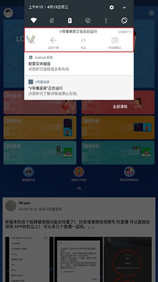 4、小编在录屏时候进入软件,可以看到手机录屏,变成停止录屏,还有时间,同时通知栏有个图标出现。