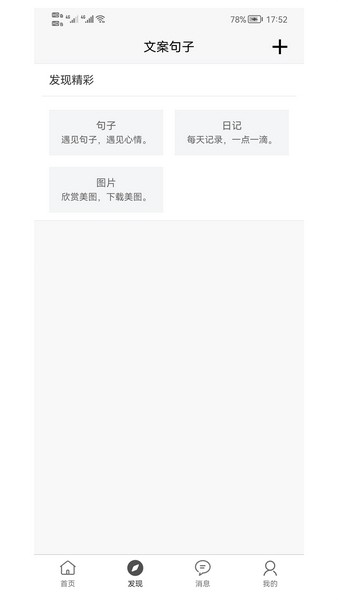 软件的功能也很全面,不仅提供海量的文案语句,还有很多美文片段和图文资源。无论是喜欢文艺风格还是励志鸡汤的人,都能在这里找到适合自己的内容。搜索功能也特别强大,想找什么主题的句子都能很快找到。特别是更新后的一些细节优化,用起来更流畅了。
