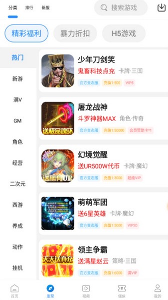 灵猫游戏盒子是一款收录了许多变态版本手游的游戏盒子类软件。在这款软件中用户可以挑选喜欢的游戏版本下载安装游玩,并且平台还有各种活动任务可以完成,有些任务会赠送给用户免费的代金券,让用户在游戏内充值时使用。平台会定期更新上线的游戏资源包版本,用户也可通过平台来快速更新游戏,还可以去购买低价的首充折扣号。
