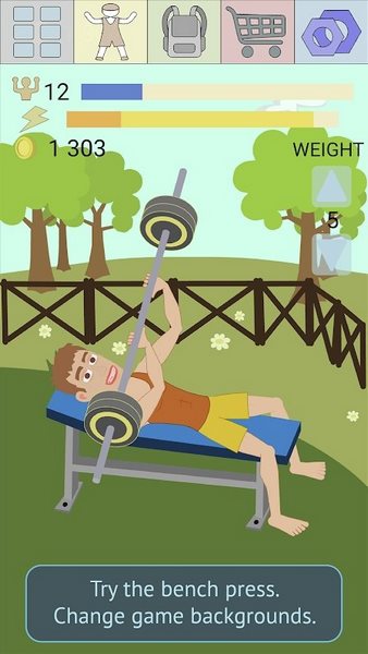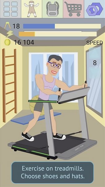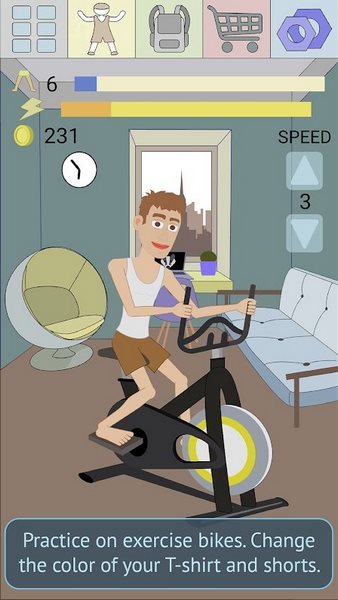 游戏中,有四个锻炼地点:哑铃、健身房、健身车和跑步机。为了获取强壮的体魄,我需要不断练习。游戏的卡通画风让我感到轻松休闲,可以购买新的哑铃,帮助我的角色变成一个强壮的男人。