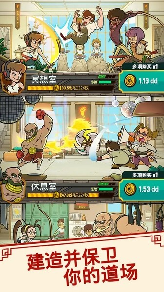 3、然后不断点击,建造更大更好的房间,训练学生们武术和空手道,并招募武术大师助阵。
