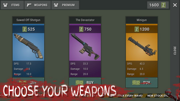 4、围堵僵尸时,可以使用左边的操纵杆移动,右边的操纵杆可指定一个方向进行射击动作,点击下方你还可以选择更多种类的武器。