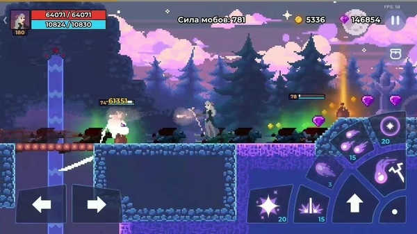 3、横版游戏屏幕,点击技能按钮随意释放魔法,火和雨的战斗伤害范围不同。