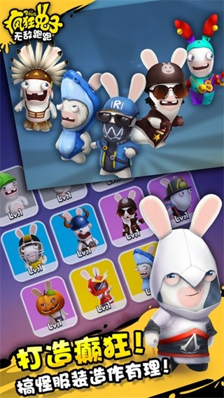 让你的疯狂兔子穿上战衣,让它们独树一帜!穿上机车服、墨西哥摔角手服装、忍者服装、内衣队长服装以及更多服装开始赛跑。每种服装都可以为你提供能力和额外的技能。