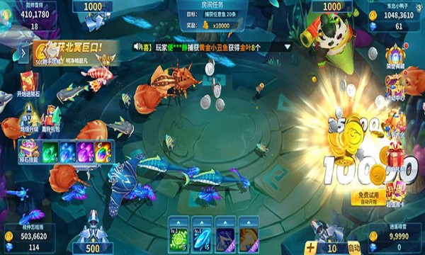 疯狂千炮捕鱼百度版是一款超好玩的捕鱼手游,不仅每天都会实时更新多种多样的挑战任务和趣味活动,你只需要每天准时上线即可轻轻松松将海量豪礼福利全部收入囊中,而且你还能够在疯狂千炮捕鱼百度版当中根据自己的相关喜好来速刷各种任务与精彩活动,如果你想要赚取更多的钱币,那么你就需要合理安排搭配好各种炮弹打击捕鱼的时机和地点了,毕竟只有这样才能够帮助你更好的从中获取更高积分。