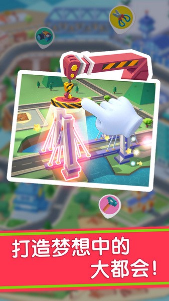 城市建设任务多,操作挖掘机、起重机、割草机等13款工程车,铺管道、搭钢筋、砌围墙、刷油漆......创建6大主题建筑,体育馆、商业区、居民区、公园、铁路、桥梁。(认识工程车,锻炼儿童手眼协调能力)