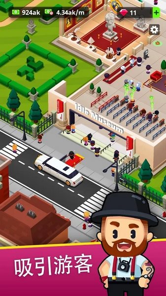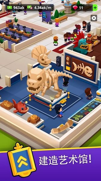 2、像经营管理模拟游戏一样管理和优化资源,建造你的艺术帝国!从一个小小展览馆开始,吸引游客进入博物馆,出售门票来赚钱,用收入去购买新的超酷艺术品收藏,并建造更多的主题展览馆!