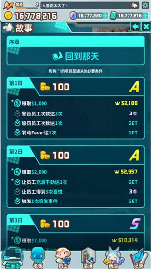 游戏中,玩家需要严格要求员工完成每日工作目标,如果员工偷懒,可以通过警告或惩罚来提高他们的工作效率。当士气值满时,员工会进入FEVER状态,工作效率大幅提升。此外,游戏还有装修办公室的功能,改善办公环境可以提升员工的效率和心情。