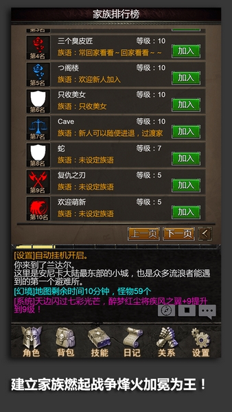 和朋友们建立一个强大的家族是一件了不起的事情,大家齐心协力提升家族等级让家族变得强大,避免在世界探险时形影孤单被人欺负,同时家族可以参与高级地区的烽火战,胜利方可以成为地区领主获得额外的战斗奖励加成与荣耀,领主家族有机会在攻城国战中击败群雄,家族创建者将加冕为王!