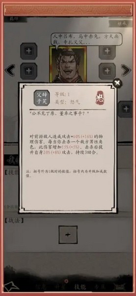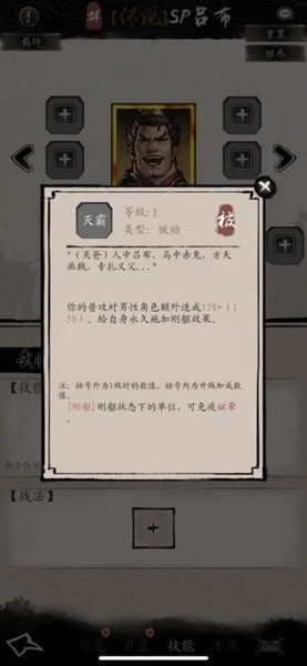 先说SP吕布,主动技能是父死子笑(杀死男性加攻击,伤害可以忽略因为我们是靠普攻)被动技能是打男性有攻击力加成,羁绊和张辽组成并州特效,攻击距离加一且普攻有25%几率横扫一排(无溅射衰减)。