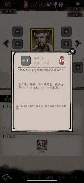 这里三美羁绊(游戏内具体称为红颜薄命):每死一个羁绊的女将领,给全体男性将领提高25%攻击,死三个就提升75%,恐怖如斯,简直比克林祭天还要燃!配合程普的75攻击%,简直毁天灭地,还有法正和郭嘉的回合加攻击还没算呢,这个配合实在是泰裤辣!不好用的话请回来批斗我,哈哈!这阵容后期怎么样,我不好说,不过至少前期,对于我们这些新手玩家,还是相当不错的!