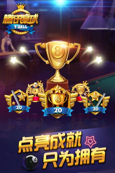 -并能让各位球友直观地了解到目前你在桌球对战中所获得的各项记录,每完成一个腾讯桌球成就,即可点亮酷炫的成就图标,而这也是你在桌球成长之路的辛勤印记。