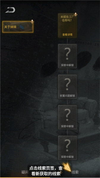 5、然后根据提示,依次点击疑问和线索提示,阅读仔细推理找到米娅。