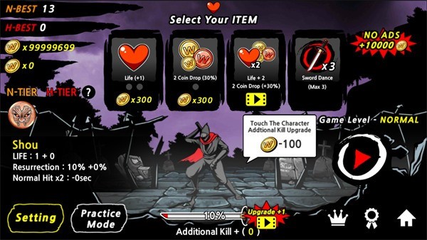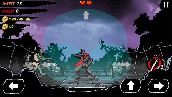 游戏的玩法十分简单。玩家所控制的角色要应对来自三个方向出现的敌人,并且要根据敌人出现的时机迅速斩杀掉目标,否则就会被敌人所斩杀。而在操作方面也比较简洁,玩家只需要控制屏幕中出现的三个按键,就可以完成对角色的攻击和移动。而随着游戏进程的深入,将会有大批量的敌人从各个方向出现,玩家所要做的就是要眼疾手快的发动攻击,不要给敌人留下任何机会,否则倒下的人也许就是你了。作为一款休闲动作手游,除了以上略带魔性的玩法外,游戏还加入了一些角色造型及场景,这些内容可以通过不断斩杀敌人所获得的金币进行解锁。值得一提的是,游戏中还加了与其他玩家的比拼,是否能够获得高分,就看各位玩家的反应能力了。