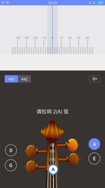 3、选择要调琴弦所对应的旋钮,然后拿琴拉这条弦的空弦,观察屏幕上部指针位置,根据文字提示去拧紧或者拧松该弦对应的旋钮即可