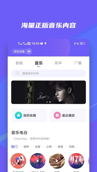 千万级正版高品质曲库内容,海量音乐资源随心听,语音搜索和智能点播两种方式随心用!