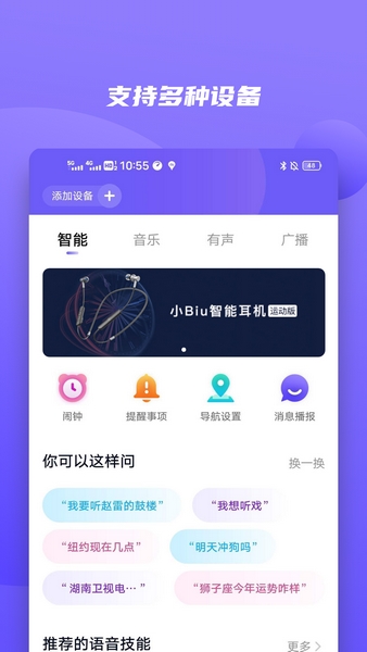 只需添加小biu智能耳机或音箱,即可无缝融合协同,让您无需拿出手机,即可通过耳机或音箱唤醒卓越的智能语音助手,并获取海量音乐有声内容点播服务。