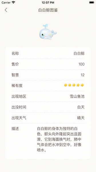 例如这个白白鲸,可以详细的看到它的稀有度、出现地区、出现时间等信息;