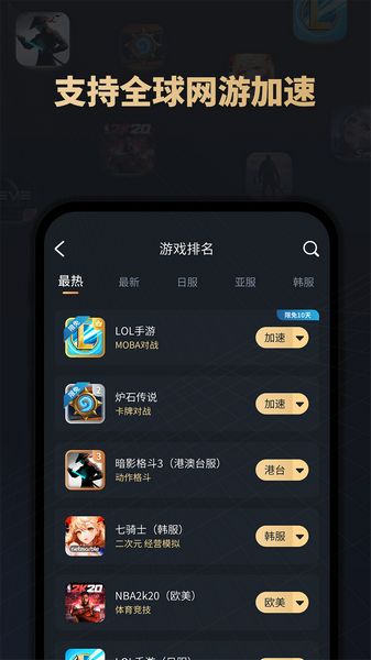 即时更新支持全球范围网游,支持海量热门游戏加速