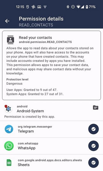 权限是预先分组的,以便于导航,例如联系人、麦克风、相机等。