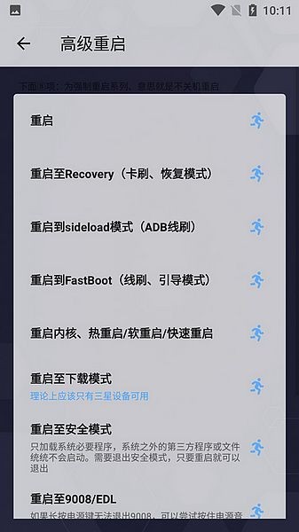 支持重启到恢复模式、引导模式、下载模式、安全模式、重启至9008、关机、重启SystemUI界面。