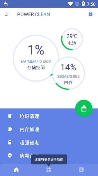 1、强力清理软件大小仅5MB左右,占用内存极小,老款手机也能完美使用;
