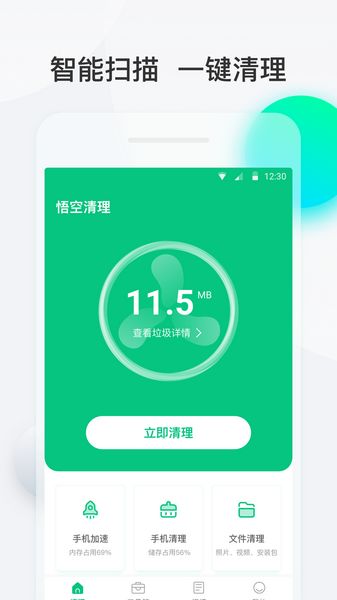 悟空清理免费版是一款手机垃圾清理软件,该软件能够帮助安卓用户一键清理手机上的垃圾文件,没用缓存,残留安装包,通过独家引擎,提高手机运行速度解决绝大部分安卓手机常见卡顿问题。同时软件能够将一些名字重复的文件进行删除,节省手机空间大小,用户只需在软件上轻轻一点,便能进行深度的清理,非常好用,如果你手机卡顿垃圾文件多那么这款软件你一定要试试。