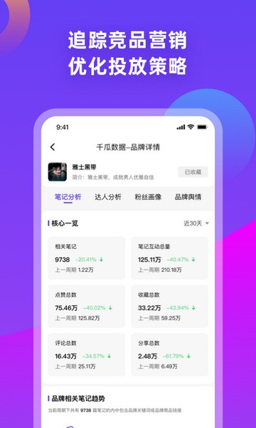 专为自媒体从业者和数据分析爱好者打造的运营管理效率与数据分析功能让千瓜数据这款软件可以帮助用户洞察市场、优化策略、实现增长。在自媒体行业,数据分析无疑扮演着至关重要的角色,千瓜数据app不仅提供全面的数据分析服务,还涵盖排行榜单、笔记监控、记录监测、投放管理等多项功能,为用户提供了全面的数据支持。满足了用户的数据分析需求的同时,千瓜数据小红书版还为品牌和企业提供了多重数据驱动解决方案,用于驱动业务决策和品牌营销。用户可以利用该软件获得小红书多维榜单、达人画像、竞品投放、营销结案、信息监测等关键数据,助力品牌提升市场竞争力。此外,软件还提供多维度的小红书达人榜单排名和达人推荐功能,以及品牌投放分析、选品找号、营销效果追踪、舆情监控等数据服务,全方位满足用户的数据需求。