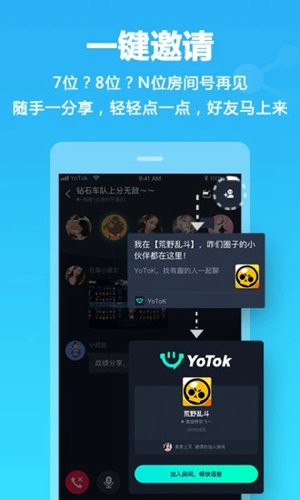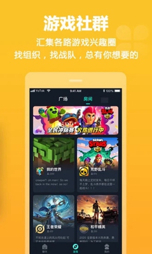 YOTOKAPP是一款主打在线游戏视频开黑的软件,界面简洁清爽,功能丰富强大,汇集海量热门游戏社区,囊括荒野乱斗、MC、王者荣耀、和平精英等,满足不同游戏的玩家在这里找队友、找组织、找战队,让你不再一人无聊游戏!并支持自己创建开黑房间,一键邀请、分享房间号,极速邀请好友一同上分!在游戏进行时,还能拉取一小块区域,与好友进行视频聊天,且占用小,不影响你的游戏发挥,开黑带妹上分更过瘾!