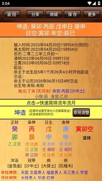 5.时空辅助盘可显示 流年、流月、流日、流时;流日,流时,对应阳历日期对照和节气时间。