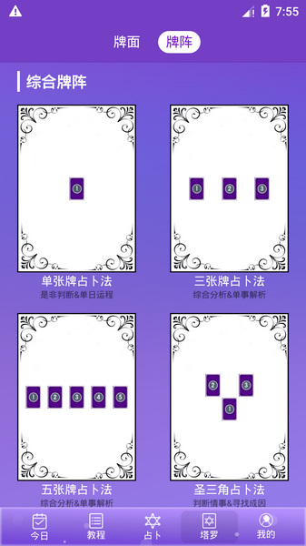 四大类牌阵,18个经典牌阵供您选择。助你成为更专业的塔罗牌占卜师。